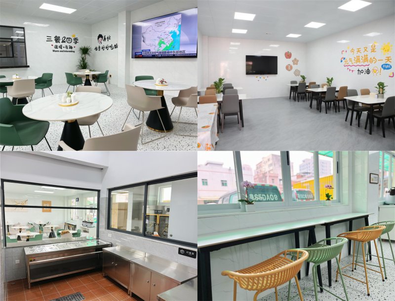 兩個(gè)新食堂以簡(jiǎn)約裝修為基調(diào),通過(guò)重新布局功能分區(qū),新配置用餐桌椅、電視空調(diào)等設(shè)備,打造出了清新自然的用餐環(huán)境。