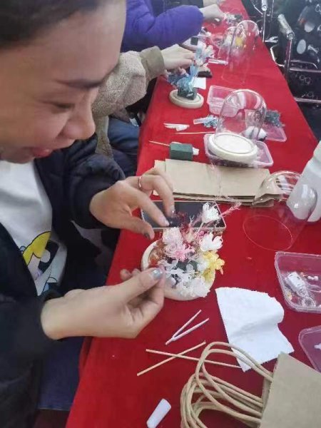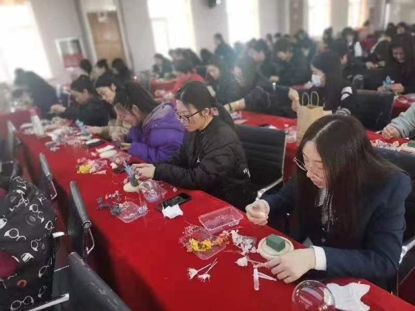 二是手工DIY制作永生花擺件。為讓女職工在辛勤的工作之余享受花樣年華,舉辦了以“與美麗為伴 攜幸福同行”為主題的手工DIY活動?;顒友埩藢I(yè)手工體驗店的老師,具體講解手工DIY永生花擺件的制作的藝術(shù)和基本知識。重點講解了插花的造型、色彩應(yīng)用要點,現(xiàn)場演示了插花的技巧。在老師詳細的講解下,大家邊聽邊學(xué)邊動手,興致勃勃地創(chuàng)作自己的作品。活動中大家或剪或插,精心構(gòu)思、巧妙搭配,將一朵朵永生花,錯落有致地插放在一起,一件件形態(tài)各異、新穎獨特的手工作品展示在大家面前,為節(jié)日增添了一道亮麗的風(fēng)景。大家臉上都綻放出美麗的笑容,傳遞著對美好生活的向往。