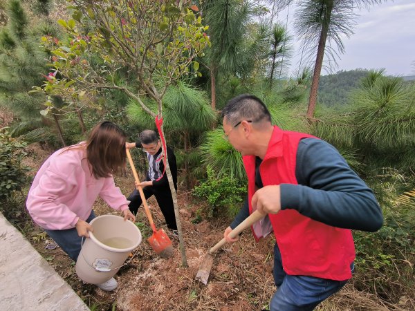 植樹活動現場,大家共同配合,挖坑、栽苗、填土、夯實土壤、澆水,植樹工作有條不紊。一顆顆樹苗在春日的陽光里巍然挺立,綠葉迎風招展,煥發出勃勃生機。