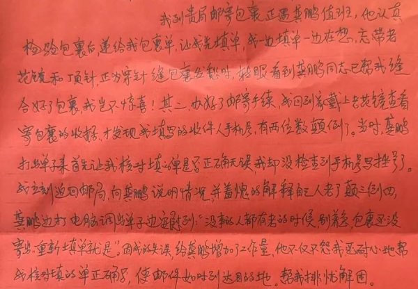 那天,用戶隋阿姨到網(wǎng)點(diǎn)郵寄包裹,物品零碎且重量較沉,龔金鵬一邊指導(dǎo)隋阿姨填寫好單據(jù),一邊快速完成了包裹檢驗(yàn)和封裝工作。再次核對(duì)完郵寄信息后,龔金鵬將單據(jù)交到隋阿姨手中,叮囑其妥善保管。業(yè)務(wù)辦理完沒過多久,隋阿姨又從回家途中折返回網(wǎng)點(diǎn),原來是她沒有戴花鏡,把電話號(hào)碼填錯(cuò)了,剛才核對(duì)時(shí)也沒看出來,回家路上才發(fā)現(xiàn)。看到隋阿姨焦急的表情,龔金鵬一直耐心安慰。“阿姨,您別急!包裹還沒寄出,郵寄信息我很快就能幫您改好。”修改完信息后,龔金鵬又與隋阿姨認(rèn)真核對(duì)了一遍,服務(wù)中的種種細(xì)節(jié),讓隋阿姨覺得既親切又溫暖。于是,她寫下感謝信,親自送到網(wǎng)點(diǎn)負(fù)責(zé)人手中,表達(dá)自己的感謝之情。