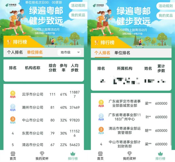 隨著生活節(jié)奏的加快和工作壓力的增大,員工的身心健康問題日益凸顯。為了積極響應(yīng)這一社會(huì)關(guān)切,并進(jìn)一步增強(qiáng)團(tuán)隊(duì)凝聚力和集體榮譽(yù)感,廣東省郵政工會(huì)特別推出了此次線上踏青活動(dòng)月?;顒?dòng)自上線以來,就受到了廣大員工的熱烈歡迎和積極參與。據(jù)統(tǒng)計(jì),全省共有6635人參與其中,網(wǎng)上健步總數(shù)達(dá)5.6億步,人均健步超過8萬余步。更令人欣喜的是,活動(dòng)中有80余名職工每日的步數(shù)都達(dá)到了規(guī)則上限,即每日2萬步;平均每天有超2000名員工登錄活動(dòng)頁面。此外,6個(gè)地市級(含省直屬單位)單位、24個(gè)縣(區(qū))級單位的活動(dòng)參與率超過了50%。