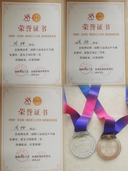 撫州市郵政職工周楠(上圖右3)參加了本次職工運動會乒乓球比賽,取得了女子團體第二名、女子雙打第三名和混合雙打三等獎的好成績。(江西省郵政工會)