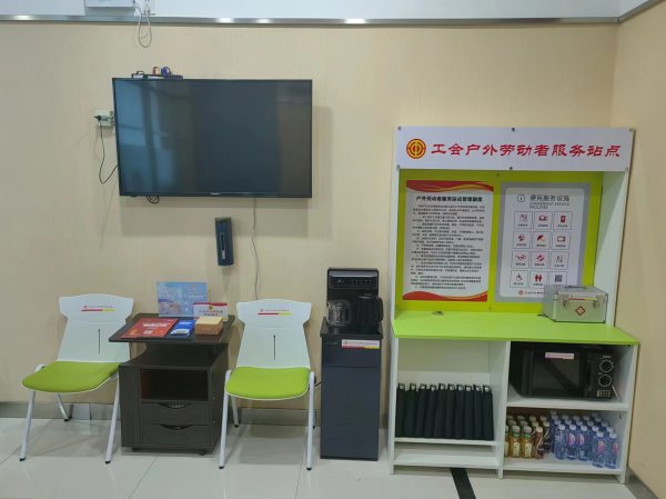 本次先行對45個站點增設配備了物品收納柜、休息椅、微波爐、雨傘、礦泉水,使站點硬件服務設施更加齊全、服務更便捷,為戶外勞動者提供更安心、更暖心的服務。目前,功能區內配備有空調、休息桌椅、物品收納柜、飲水機、微波爐、充電器、置物柜、醫藥箱、礦泉水、工會報刊書籍及工會宣傳冊等,切切實實為戶外勞動者提供冷可取暖、熱可納涼、渴可喝水、累可歇腳、傷可用藥、閑可閱讀的細心周到服務。