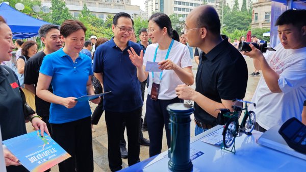 開幕式當天,第二屆申動嘉年華活動在盧灣體育中心外場舉辦,22家單位在現場布展,吸引了參賽運動員和周邊群眾駐足,既充分展示了企業文化品牌,又為炙熱的賽事氛圍再添一把火。黃浦區分公司在現場設攤提供服務,精美的文創產品和郵冊得到了現場觀眾的極大關注。(圖為上海市總工會黨組書記、副主席沈軍參觀郵政展臺,黃浦區分公司總經理劉麗芳做現場講解)