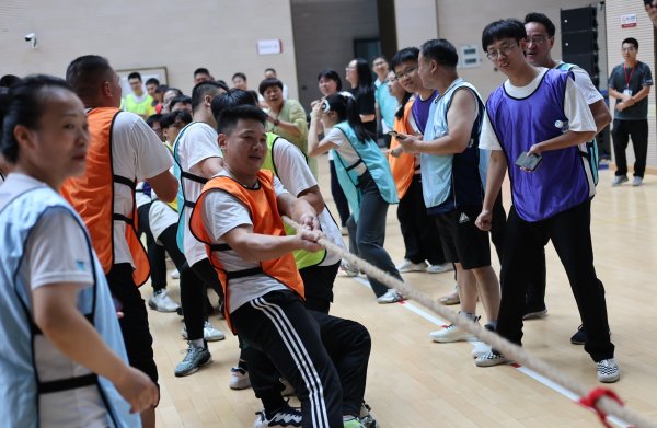 最后兩個項目:“紙杯接力”“拔河比賽”為郵銀對抗賽,接力賽中運動員們或專注疊杯,或奮力奔跑,隊員們團結一致,全情投入。重頭戲“拔河比賽”,將整場運動會氣氛推向高潮,雙方各派出最強健的運動員,大家蓄勢待發,扎穩腳步,“起繩,拉緊,預備,開始”,隨著裁判員的一聲令下,參賽隊伍劍拔弩張,參賽隊員個個顯示出力拔山兮氣蓋世的英雄豪邁。隊員們氣勢如虹,他們身體后仰,重心后壓,其專業的動作、一致的步伐、整齊的口號,讓現場的每一位觀眾看得心潮澎湃,都為參賽隊員加油鼓勁。