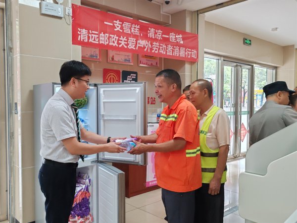 (清遠市分公司 支局長在“清涼驛站”為戶外勞動者送雪糕)