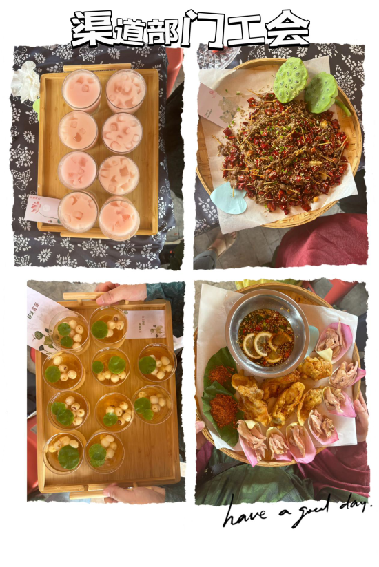 緊接著,二十余道美味相繼出鍋,令人目不暇接。一道道色香味俱全的佳肴被相繼端上評委席,“嘗”委們品菜、點評、打分,好不熱鬧。其中,渠道部門工會的“‘荷’你在一起”、牙簽牛肉奪得頭名,其上菜過程更是令人耳目一新。“上菜員”們身著漢服,用精致的擺盤、另類的解說和豐富的口味徹底“征服”了“嘗”委們。另外,婁星區分公司烹制的“夏日清蓮”“‘肘’遍天下”摘得第二名;漣源分公司的“‘井’上添花”、啤酒鴨奪得第三名。