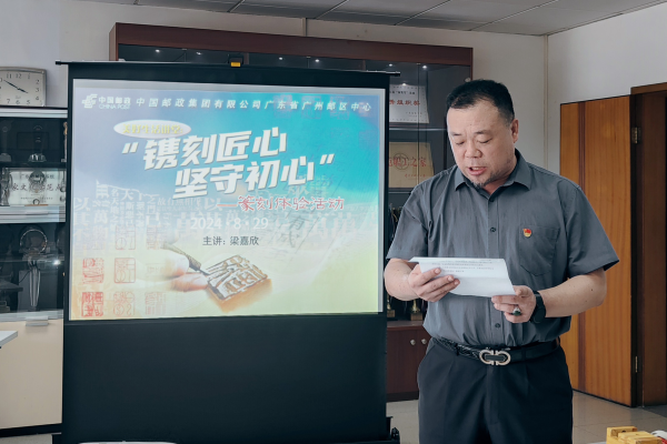 活動伊始,廣州郵區中心工會副主席高東林作了熱情洋溢的致辭。他表示:“在這個快節奏的時代,我們往往容易忽略那些需要耐心與專注才能成就的美好。今天,我們相聚在這里,通過篆刻這一古老而又充滿智慧的藝術形式,不僅是要體驗一種技藝的傳承,更重要的是要學習那份‘鐫刻匠心,堅守初心’的精神。希望每一位參與者都能從篆刻的每一刀、每一劃中,感悟到對工作的執著與熱愛,對生活的細膩與溫情。”
