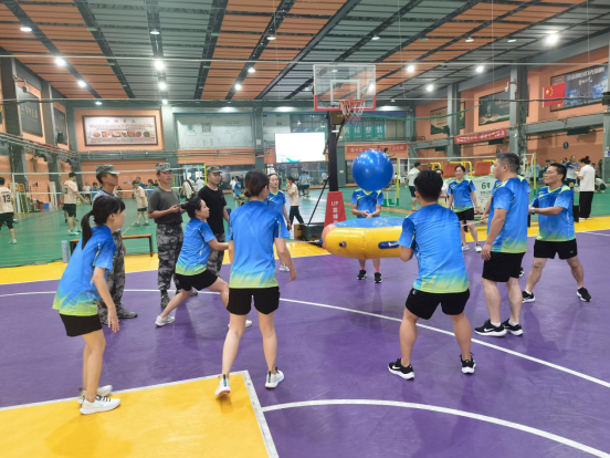 比賽正式開始,參賽選手都拿出了看家本領(lǐng)。在氣排球賽場(chǎng)上,隊(duì)員們猛烈的扣球攻擊、巧妙的雙手接球,互為攻守,精彩連連,讓現(xiàn)場(chǎng)的觀眾喝彩聲不斷;在趣味運(yùn)動(dòng)賽場(chǎng)上,隊(duì)友們?cè)跉g聲笑語(yǔ)中團(tuán)結(jié)協(xié)作,揮灑汗水,奮力拼搏,旁邊拉拉隊(duì)加油聲此起彼伏;裁判員和工作人員各司其職,保證了各項(xiàng)比賽正常進(jìn)行……。