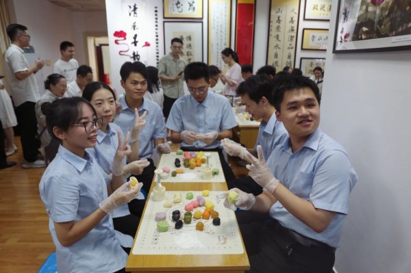 當晚最受大家歡迎的則是月餅制作環節。在烘焙老師的指導下,帥哥美女們分工合作、互幫互助。揉面團、壓餅皮、包餡料、壓成型……大家在一步步用心制作月餅的過程中,打破了彼此間的尷尬,將滿滿的心意,揉裹在那一方美味中。青年員工們通過巧手制作月餅,體會郵電的溫情、傳統文化的魅力,現場洋溢著濃濃的節日氛圍。