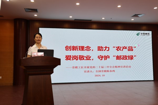 本次活動由全國勞模、全國五一勞動獎章獲得者陳春鴻同志主講。會上,陳春鴻同志發表了題為《創新理念,助力“農產品”;愛崗敬業,守護“郵政綠”》的宣講,就黨的二十屆三中全會的深遠意義、中央重要講話精神及全會《決定》進行了全方位的講解。