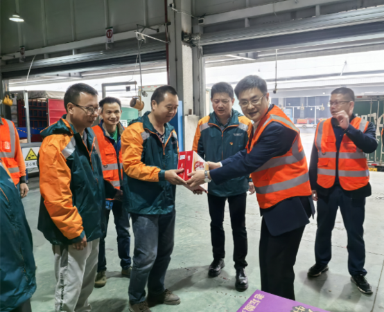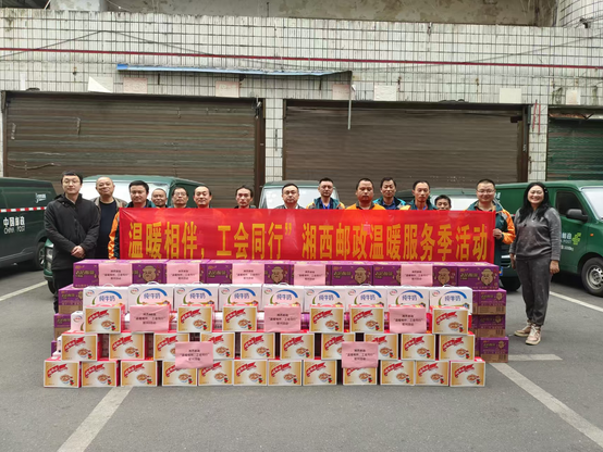 2024 年 11 月 14 日,“雙十一”快遞業務旺季之際,湘西州分公司負責人單鋒總,副總經理彭迎國;副總經理、工會主席劉春華;攜州分公司辦公室、工會等相關部室負責人一行,先后深入桐油坪攬投部、普郵攬投部、網路運營中心等一線生產現場,為辛勤工作的員工們送上了方便面、牛奶、八寶粥等慰問品;積極開展“溫暖相伴,工會同行”溫暖服務季關愛慰問活動。