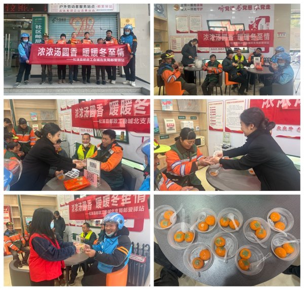驛站里一派歡聲笑語的節日景象。郵政工作人員熱情地為環衛工人、快遞員、外賣員等戶外勞動者們盛上熱氣騰騰的湯圓,不忘提醒他們在寒冷的天氣中注意保暖和交通安全。一份甜蜜的湯圓、一個溫暖的笑容、一句溫馨的問候,無不傳遞著郵政濃濃的深情厚意。戶外勞動者們高興地說道:郵愛驛站工作人員真細心,一顆顆柿子形狀的湯圓,寓意著事事平安、健康幸福的美好愿望,在寒冷的冬日里,這一碗湯圓不僅暖胃,更暖心。