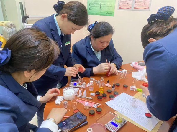 楊行支局的女職工們?nèi)褙炞ⅲ两谟H手制作口紅的樂(lè)趣中。色彩斑斕的原料整齊排列,從稱量色粉到精準(zhǔn)調(diào)色,當(dāng)一支支獨(dú)一無(wú)二的口紅在手中誕生,成就感油然而生。