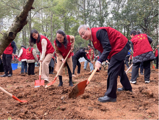 植樹現場,株洲郵政分公司黨委書記、總經理涂永昕帶領領導班子成員與郵政職工一起,揮鍬鏟土、提水澆灌,合力栽下黃桃樹、黃金柚樹等苗木。