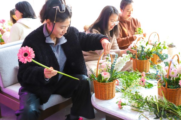 聽完老師的講解,女職工們插花創作熱情高漲。大家手持鮮花修剪枝葉、搭配色彩,把普通的花材變成一籃籃細致精美的花藝作品。現場花香四溢、笑語歡聲,大家手捧鮮花互相交流心得,分享喜悅、暢談人生,用鏡頭記錄下自己的“花漾”成果....
