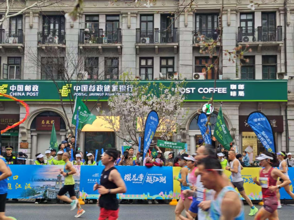 為展示企業(yè)文化和郵政員工的良好精神風(fēng)貌,按照湖北省郵政工會(huì)的統(tǒng)一部署,武漢市郵政工會(huì)組織了三支啦啦隊(duì)于比賽當(dāng)天分別在江漢路、六渡橋和彭劉楊路網(wǎng)點(diǎn)門口的賽道旁為選手鼓勁加油、吶喊助威。這三個(gè)郵政網(wǎng)點(diǎn)不僅沿街緊靠賽道、是選手們的必經(jīng)之路,同時(shí)各有特色:江漢路郵局2024年新裝改造后以咖啡郵局華麗轉(zhuǎn)身,一開業(yè)就吸引了不少年輕人前來打卡,六渡橋郵局寫滿了老漢口的城市記憶,彭劉楊路郵局更是以年輕的身影煥發(fā)著百年郵政的生機(jī)和活力。武昌區(qū)分公司、江岸區(qū)分公司、江漢區(qū)分公司高度重視,精心組織,每個(gè)區(qū)分公司提前分別挑選了15名青年員工組成啦啦隊(duì),配上省分公司統(tǒng)一制作的主題為“櫻花季 郵精彩 越江湖”“湖北郵政為熱愛加速”“湖北郵政見證你的每一公里”的紅色宣傳橫幅、醒目郵政logo的綠色馬甲、白色的運(yùn)動(dòng)帽、粉色的手搖宣傳板,郵政啦啦隊(duì)的氣場十足。