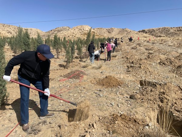 清晨的共和縣春風(fēng)和煦,全體人員抵達(dá)后按照預(yù)先分組迅速投入勞動。領(lǐng)導(dǎo)班子率先揮鍬,黨委書記吳偉東率先示范標(biāo)準(zhǔn)種植流程,工會主席張敬亮帶領(lǐng)人員組成"傳土接力隊(duì)",三五成組開啟"植樹競賽"。揮鎬破土的鏗鏘聲、測量株距的商討聲、傳遞樹苗的接力聲交織成奮進(jìn)交響曲。經(jīng)過技術(shù)員現(xiàn)場指導(dǎo),全員采用"三埋兩踩一提苗"科學(xué)種植法,從分層培土到圍堰澆水,每個環(huán)節(jié)都精益求精,確保400余株樹苗以2.5米標(biāo)準(zhǔn)株距扎根山野。