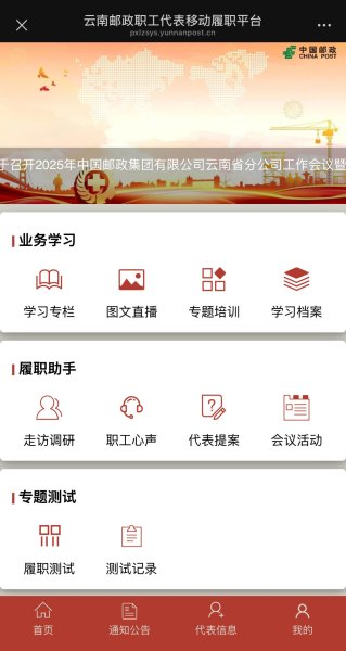 為不斷強化云南郵政職工代表政治素養、建言履職等一系列能力,充分發揮職工代表動員、引導廣大職工積極支持、主動參與企業改革發展的作用,云南郵政工會會同省信息技術中心開發上線了“云南郵政職工代表移動履職平臺”(以下簡稱“平臺”)。該“平臺”集學習培訓、專題測試、移動履職等三個主要功能于一身,旨在通過信息技術手段提高職工代表的履職能力和效率。