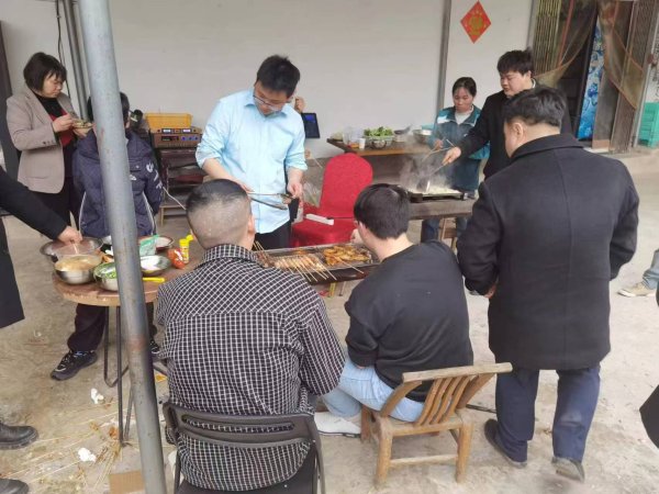 活動當日,員工們早早集合,帶著精心準備的食材奔赴目的地。雞、餃子皮、五花肉、鮮魚等食材一應俱全,為這場野炊盛宴奠定了基礎。到達目的地后,大家迅速分工協作,生火、串食材、包餃子,現場氣氛熱烈而有序。最考驗耐心的環節莫過于生火——有人架柴火,有人點炭爐,扇風、吹氣、點報紙,忙得熱火朝天。盡管煙熏火燎,甚至有人被嗆得淚流滿面,但經過一番努力,爐火終于熊熊燃起,為后續的烹飪提供了關鍵保障。
