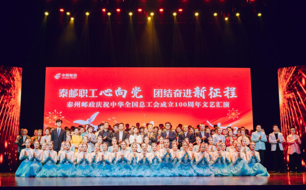 2025年,中華全國總工會成立100周年。為向百年工運史詩致敬,為新時代勞動者喝彩,4月29日,泰州市郵政工會組織開展了慶祝“中華全國總工會成立100周年”文藝匯演。泰州市總工會、市郵政管理局領導,市、縣(市、區)郵政分公司領導班子、部門負責人、支局(所)、攬投部經理、2024年度泰州郵政先進生產(工作)者、工會積極分子、優秀黨員、勞模先進代表等400多人參加了當天的活動。為表彰先進,激勵人心,匯演開始之前,市分公司對2024-2025年度金融跨年度競賽中表現優異的單位和個人進行了表彰和頒獎。