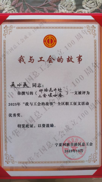 近日,寧夏回族自治區(qū)總工會(huì)“我與工會(huì)的故事”全區(qū)職工征文活動(dòng)評(píng)選結(jié)果揭曉,銀川郵政工會(huì)選送的職工吳小英憑借真摯動(dòng)人的作品榮獲優(yōu)秀獎(jiǎng)。