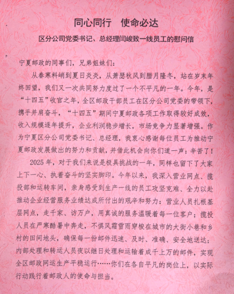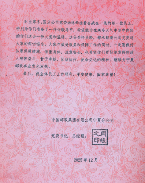 時(shí)至寒冬,氣溫驟降,區(qū)分公司黨委始終堅(jiān)持以人民為中心的發(fā)展理念,時(shí)刻牽掛著奮戰(zhàn)在服務(wù)一線的郵政員工。為切實(shí)保障一線員工在嚴(yán)寒天氣下工作舒適與身體健康,讓大家暖心上崗、安心履職,區(qū)分公司黨委書記、總經(jīng)理閆峻提前部署、親自指導(dǎo),責(zé)成區(qū)分公司機(jī)關(guān)工會(huì)遴選采購(gòu)了一批保暖性能優(yōu)良、穿著便捷實(shí)用的保暖馬甲,與一封帶著深深關(guān)切和殷殷囑托的慰問信一同送到了基層一線員工的手中。區(qū)分公司黨委希望大家在做好生產(chǎn)經(jīng)營(yíng)、服務(wù)保障工作的同時(shí),做好防寒保暖措施,保重身體,注意安全,也希望廣大干部員工更好地發(fā)揮郵政人艱苦奮斗、甘于奉獻(xiàn)、團(tuán)結(jié)協(xié)作、使命必達(dá)的精神,為寧夏郵政事業(yè)發(fā)光發(fā)熱。